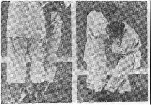 (1)注意一方在扫踢时,不要太弯腰,不能用脚尖扫踢, 而要把左脚伸直用脚掌外侧用力,腰要顺势转动以配合用力,扫 踢对方并起的两脚。参照(图136)。
