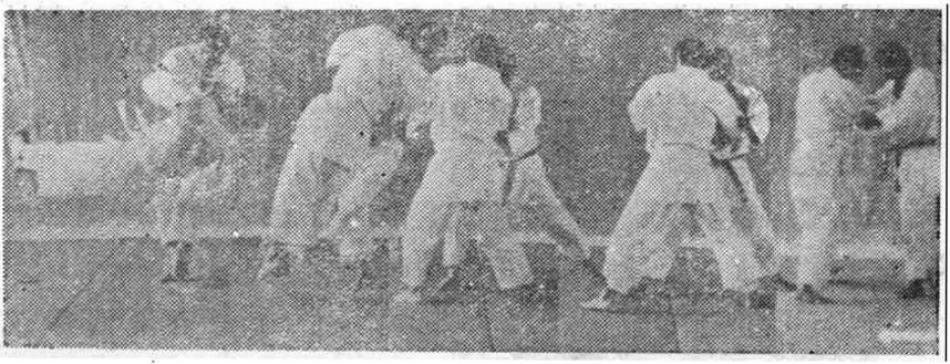 (3)与对方不要正面组合,而要稍错开偏向左侧。当对方 向左移动时,两人拉开距离,再紧跟上顺势扫踢,这样便于用 力。