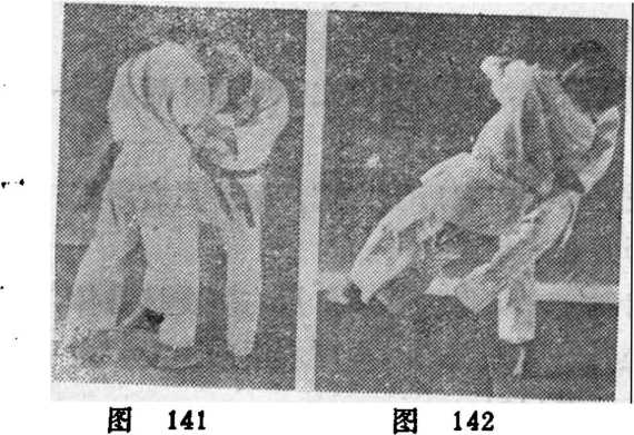 (4) 一方右脚向对方左脚附近移动,用右脚支撑身体,把 左脚贴在对方右脚踝处向斜后方扫踢。同时右手向上提,左手向 下拉,使对方摔倒。见(图140)。