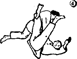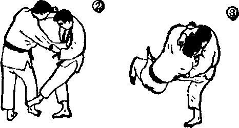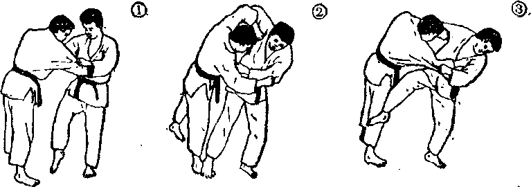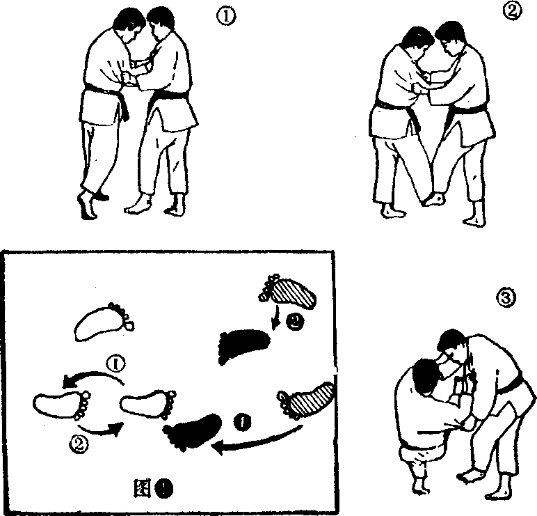 动作过程:双方均以右自然体站立交手。用左手抓住对 方的右中袖,用右手抓住对方的左前领。上左步迫使对方右 脚后退,右脚迅速向对方右脚内侧上步,左脚立即向自己的 右脚跟附近跟进一步。身体左转,并将左脚尖向外拧转。右 腿提起别住对方膝下胫骨部位,以左腿支撑身体,上体不