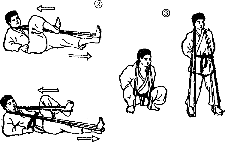 方法二(图140-②)'仰卧在垫子上,用橡皮条挂在, 颈部和两脚掌上,两腿交替蹬屈。