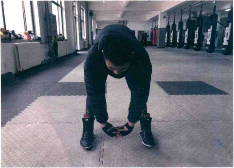 3 动作细节双脚开立两倍肩宽站立。双手在体前十指交叉肩关节内旋使手掌向下屈髅下压手贴地面。4 动作目的增加髓关节活动幅度增加大腿后侧肌群延展度。