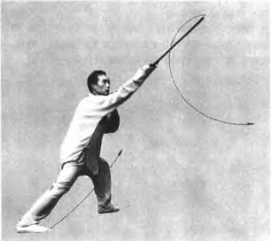 图13图13动作右腿屈膝在身前提起,脚背绷忆脚尖朝卜左腿伸直独忆同时右持剑从右上屈肘腕内旋、手心翻朝卜弧形环绕至右腿前此刻直臂向前截剑,剑