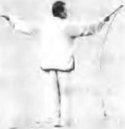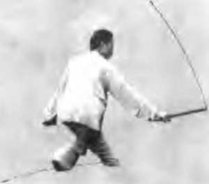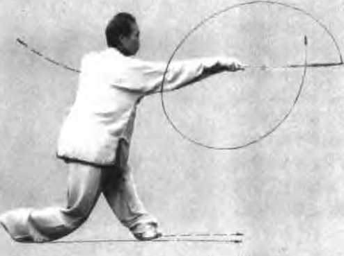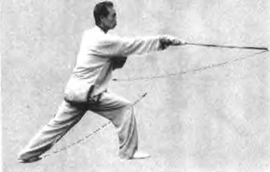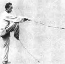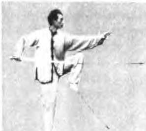时向后抽回于右腰侧拇指一侧朝匕左手剑指随向前指出左脚随之提膝抬起如图15,然后左脚向前正东方摆
