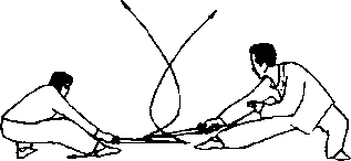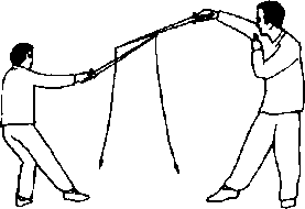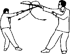 用法接前式,乙方进步横扫甲腰部,即向后含胸侧身 让过剑锋,同时以剑顺势屈肘、屈腕划割乙方腕部。乙向左逃 腕,甲陡嬷右剑以腕关节为轴绕剑向上崩挑乙腕,乙即向后撤 步,上身真起,右剑随向后略提躲过,然后扑步下蹲,右剑随向 下沉压甲剑。