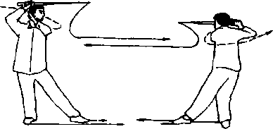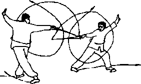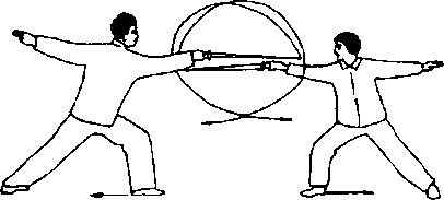 用法接前式,当乙插步左下截甲腕,甲即向后退步, 右后转身,右手持剑向后收回,贴身上撩,收提于头部右侧,以 观变化。乙同时也向后退步,右后转身,右手持剑贴身上撩, 收提于头部右侧,以观其变。