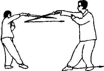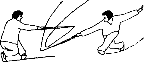 用法甲见乙插步下踊截腕即屈肘向右下抽剑逃开。乙即上身直起向前进步,右剑向甲耳部刺去