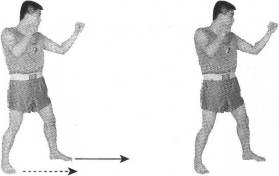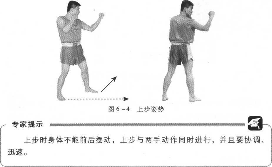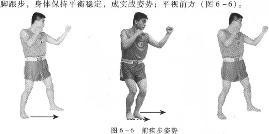 以实战姿势开始,后脚蹬地,前脚(左脚)先向前进半步,后脚再跟进 半步,平视前方(图6-2)。