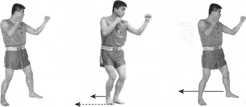 前脚向后退步,全脚掌踏于后脚内侧,同时后脚向后退步;后脚落地,前 脚随之后撤步,身体保持平衡稳定,成实战姿势;平视前方(图6-7)。