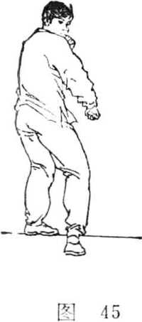 落步,脚尖内扣;同时身体向右后转,左手护头,右手护肋、 腹部,目回视对手(图46、47)。