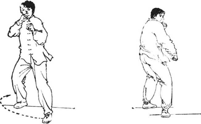 要点:以腰带腿,步法移动时两手随之应变。转身要疾 速稳健并随时体察对手动向。