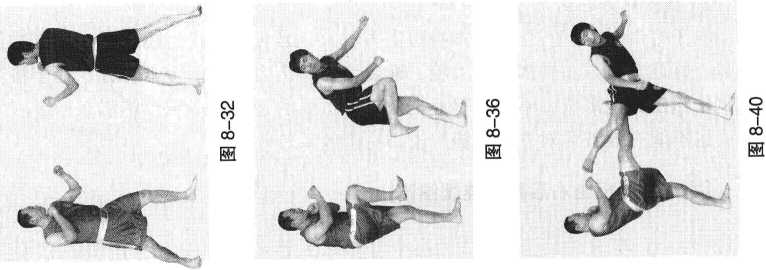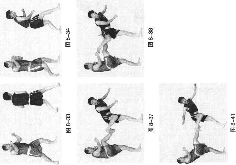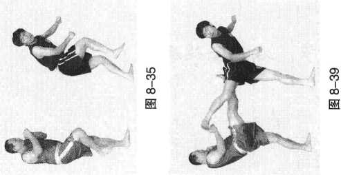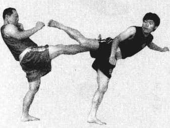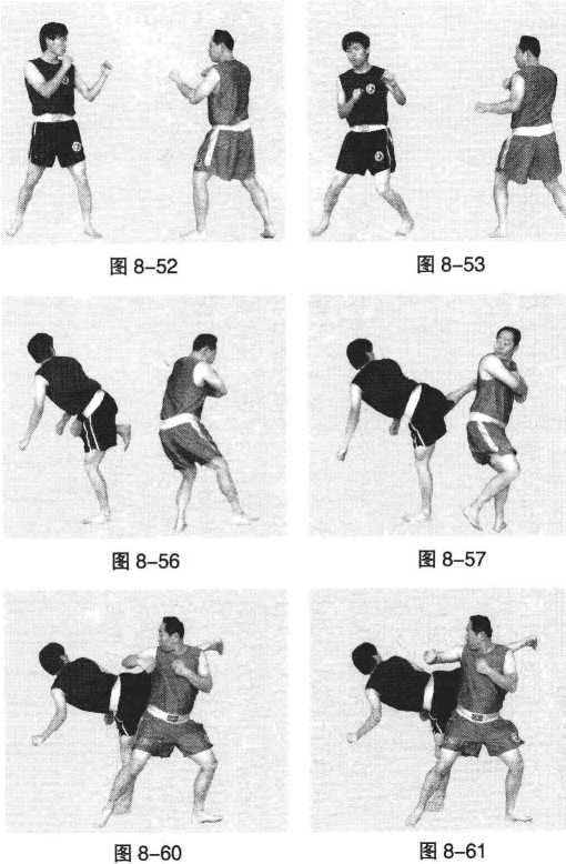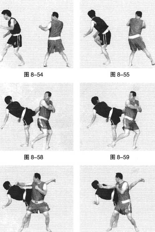 当对方右后蹬腿打击我方腹部或胸部,我方右正蹬腿打击对方臀部或右 大腿。