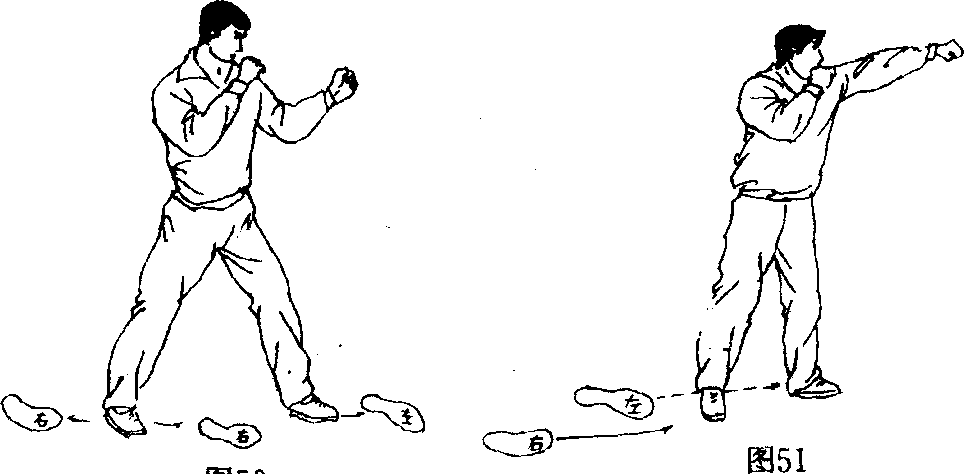 左脚在前,实战步。右脚掌蹬地,左脚掌擦地面向前移动, 上体保持平稳,右脚紧跟向前,目视前方(图50),也可以进步 同时重心前移发拳(图51)。