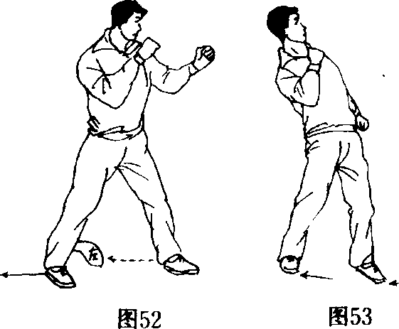 左脚在前实战步。左前脚掌蹬地,右脚擦地面向后撤步, 左脚随之紧跟后撤(图52)。也可以后退时上体后仰,下颌回 收,目视前方(图53)。也可以前脚先后撤步,然后后脚再后