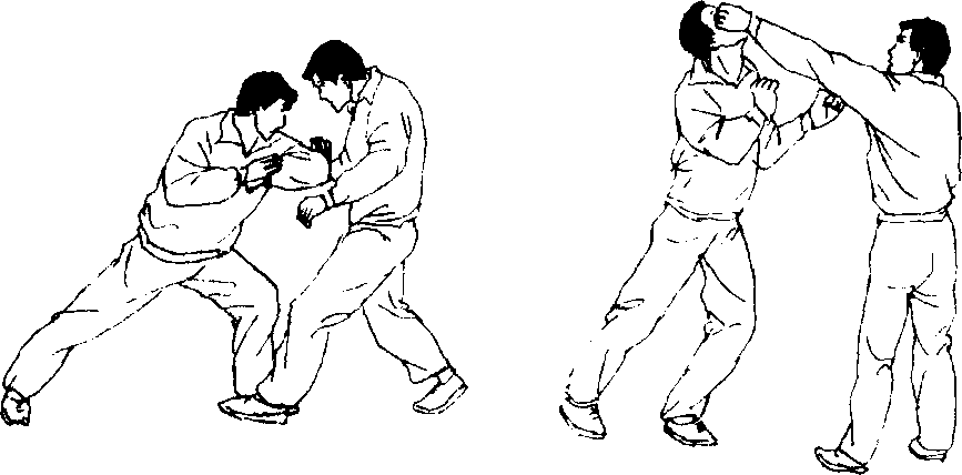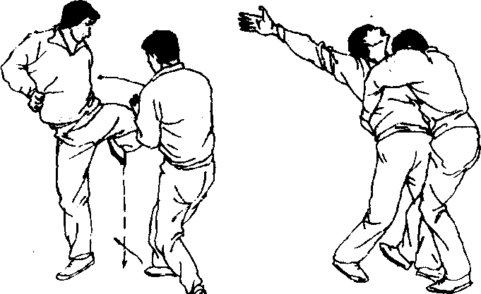 9. 乙用右侧顶膝攻击甲中盘,甲用双手推按来膝,趁乙 脚落地时,甲上右步落脚于乙左脚后封住其腿,同时双手抱住 乙腰,上体前倾,用折腰将乙摔倒(图277、278)。也可以推其 来膝后用直拳击乙面部(图279)。