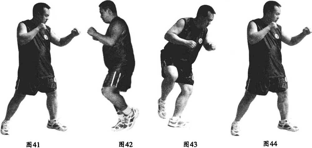 练习者以左实战姿势站立身体右转180度同时左脚向右脚前方跳落步随之上体继续右转身180度且右脚向体后提起落步成左实战姿势目视前方。(图41-44)
