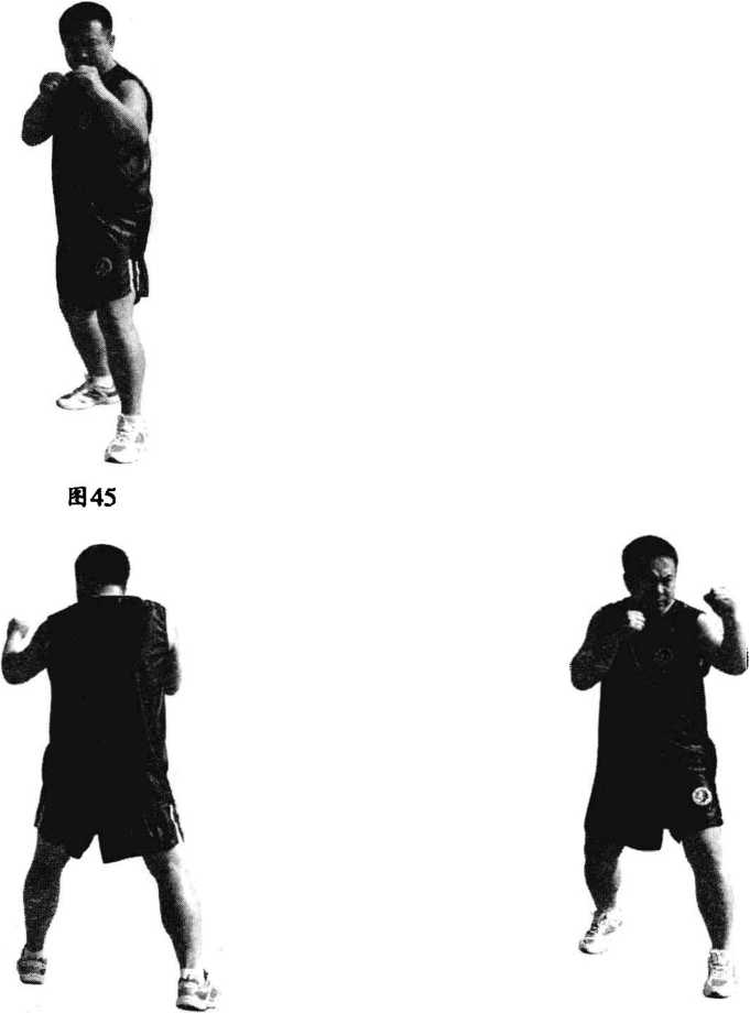练习者以左实战姿势站立,以左脚为圆心在原地拧转右脚按顺时或逆时成圆圈形侧移步同时上体随动双手臂屈肘回护体前目视前方。(图45-48)