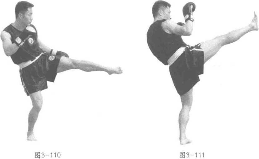 1左鞭腿-右蹬腿(图3-110、图3-111)