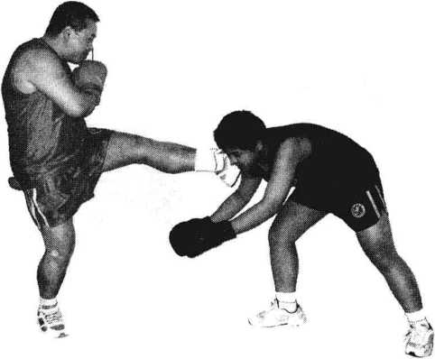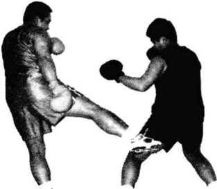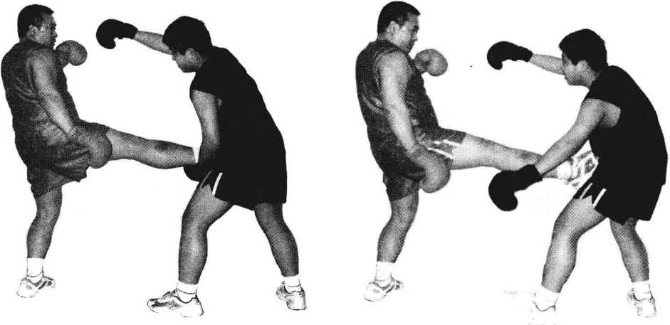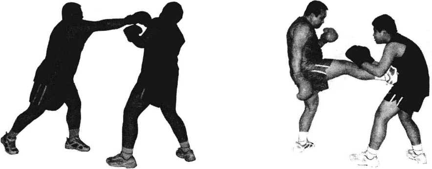 战例5:实战时,对手突然上右步潜身用抱腿摔技 抢攻我,我快动发左前蹬腿狠踢对手右肩部破阻其进 攻,同时我双手回护胸前,目视腿方(图7)。
