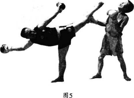 战例3:实战时,我突然左转身发右后撩腿攻踢对手腹部,对手快动用手臂向下拍 阻我腿,接着我连发左后撩腿连踢对手头部,使其丧失战斗力,我双手随前后摆动,目 转视后方(图4、5)。