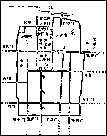 ①宿白:《魏晋南北朝考古》,《中国大百科全书?考古学卷》,中国大百科全书出版社,1986年。 洛阳,重点在集中宫苑衙署和加强西北隅的军事据点。北魏扩建洛阳城和东魏北 齐新建邺南城,除了进一步利用旧有的防御设施以外,还扩大并规整了居民区(坊 里),调整并对称地安排了工商业区(市),因而都城中人口集中和工商业发达这 些时代特点十分突出。北魏洛阳和北齐时期的邺城都营建了众多的佛寺。有名的 北魏洛阳永宁寺遗址已进行了发掘,北齐邺城的兴圣寺也开始了勘察。