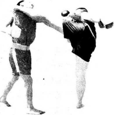 双方对峙对手突然出左直拳打击我的面门我快动应变体向右侧闪用右手-外拍破化来拳同时发左高边腿狠踢对手的头颈使其受到重创。目视腿方(见图3—108)。
