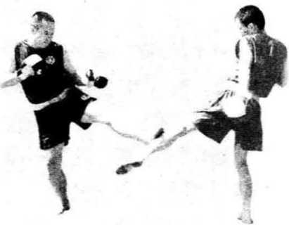 双方对峙对手突然发左低边腿攻踢我的腿部我快动应变用左前蹬腿向体前斜下方阻踢破化来腿。双手回护体周目视腿方(见图3—109)。