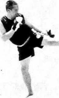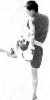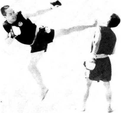 双方对峙对手突然提左腿欲用腿技进攻我我快动抢先发左侧踹腿迎阻对手左脚踝处接着我左腿落地双脚蹬地身体腾空连发凌空左侧踹腿狠踢对手头部使之造成重创。我双手随动目视腿方(见图3—140?3-141)。
