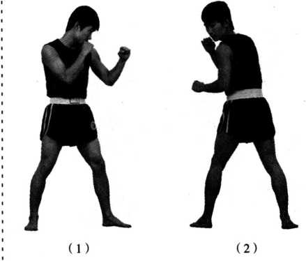 对方左冲拳击来。我方左脚向左横跨半步,同时,