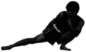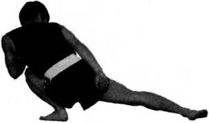 轴向左转头、转体同时,左腿屈膝下蹲右脚伸直脚