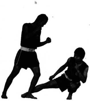 当对方出左冲拳左腿在前时我方以前扫蹬腿扫击对方左腿,这样既可通过下蹲避过来拳又可将对方扫击倒地(图367)。