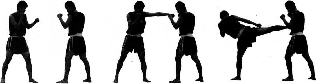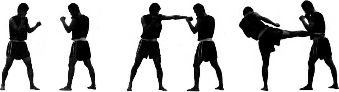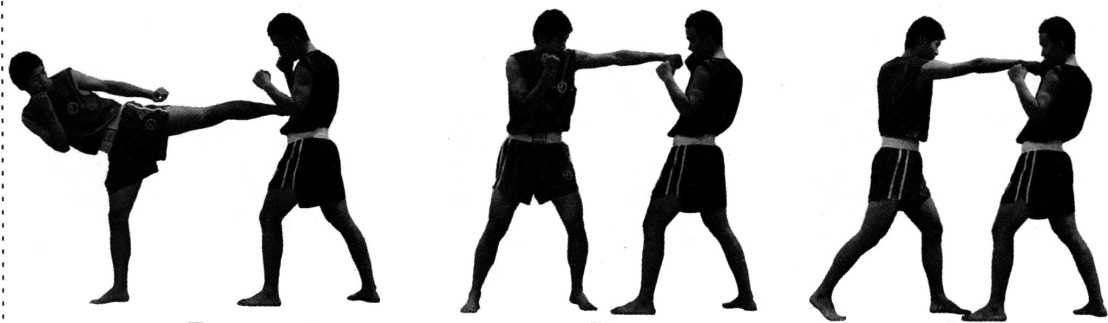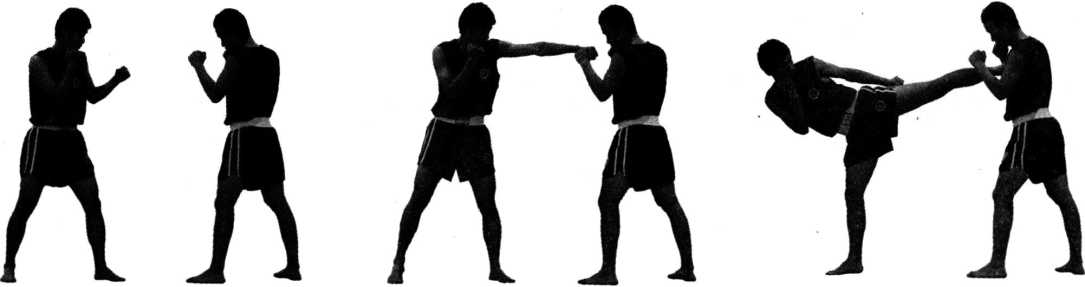 双方由实战姿势开始一方垫步以左踹腿踢击对方腹部随后直接以左右冲拳连击对方面部(图410?图412)