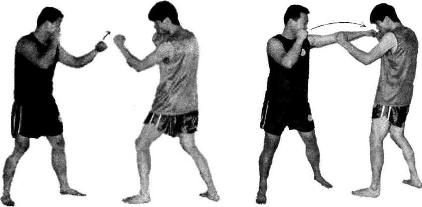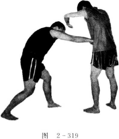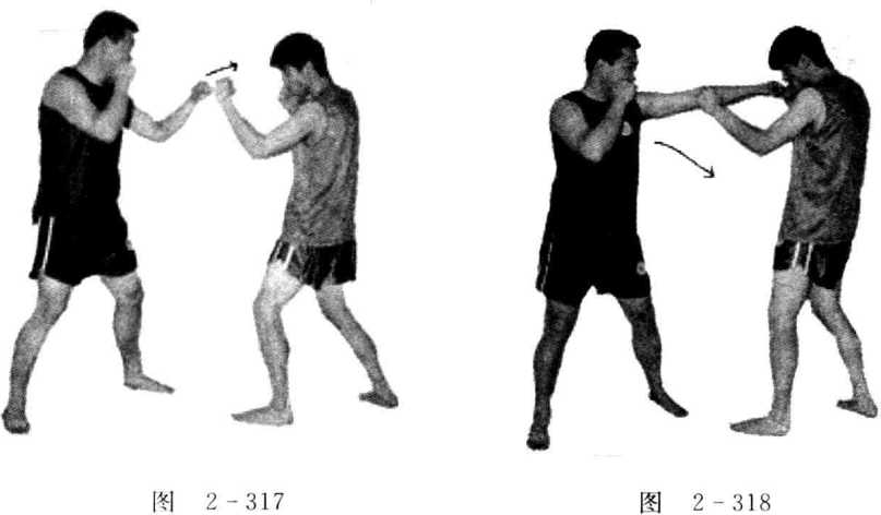双方由实战姿势开始,一方进步用左冲拳虚晃击打对方面部;然后疾步 用右冲拳击打对方腹部(见图2-317、图2-318、图2-319)。