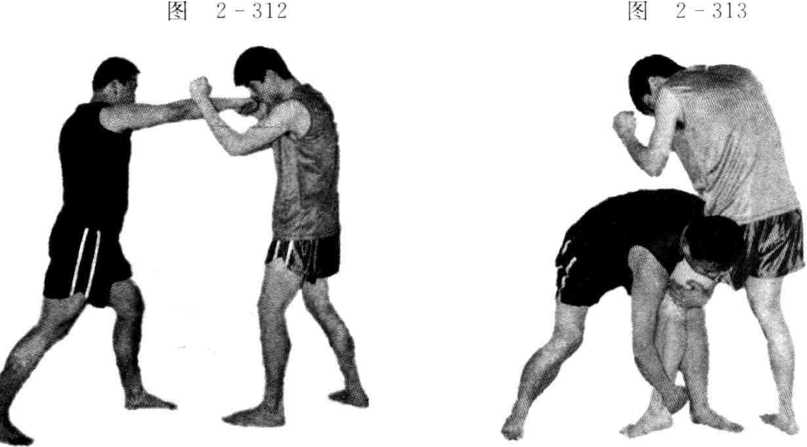 双方由实战姿势开始,一方疾步用左右冲拳击打对方面部;然后进步左 手抄抱对方前大腿,右手抓住对方前脚外踝处,以旋压摔法将对方摔倒(见 图 2-312、图 2-313、图 2-314、图 2-315、图 2-316)。