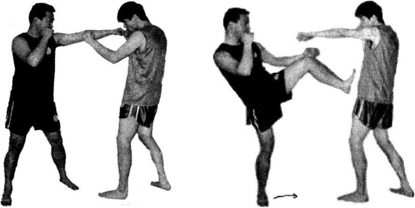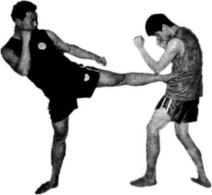 双方由实战姿势开始,一方进步用左冲拳虚晃击打对方面部;然后滑步 用左正蹬腿踢击对方腹部(见图2 - 320、图2-321、图2 - 322)。