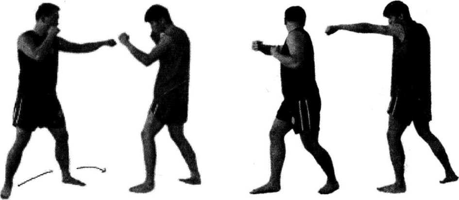 要求:尽量迫使对方向体左侧移动,以便在左晃完成后用右鞭拳进攻。 鞭拳要快速、有力。