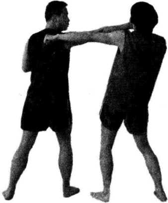 双方由实战姿势开始,一方进步用左冲拳虚晃击打对方面部;、然后插步 转身用右鞭拳击打对方头、面部(见图2 - 323、图2 - 324、图2-325)。