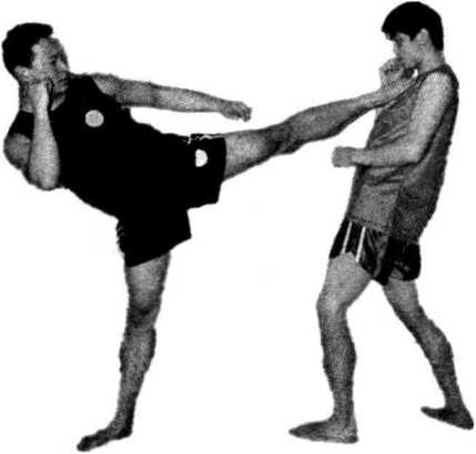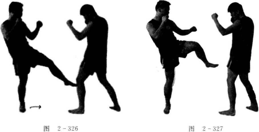 双方由实战姿势开始,一方滑步用左侧弹腿虚晃击打对方腿部;然后垫 步用左踹腿踢击对方胸部、头部(见图2 - 326、图2 - 327、图2 - 328)。