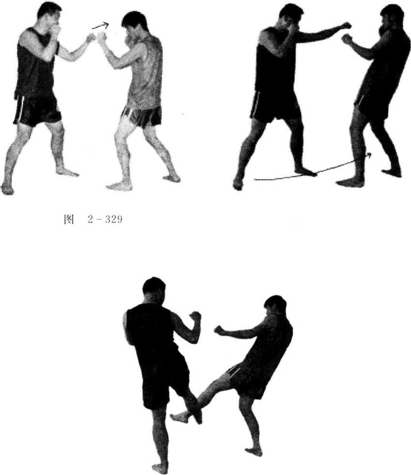 双方由实战姿势开始,一方进步用左冲拳虚晃击打对方面部;然后向左 进步,右腿勾击对方前小腿(见图2 - 329、图2 - 330、图2-331)。