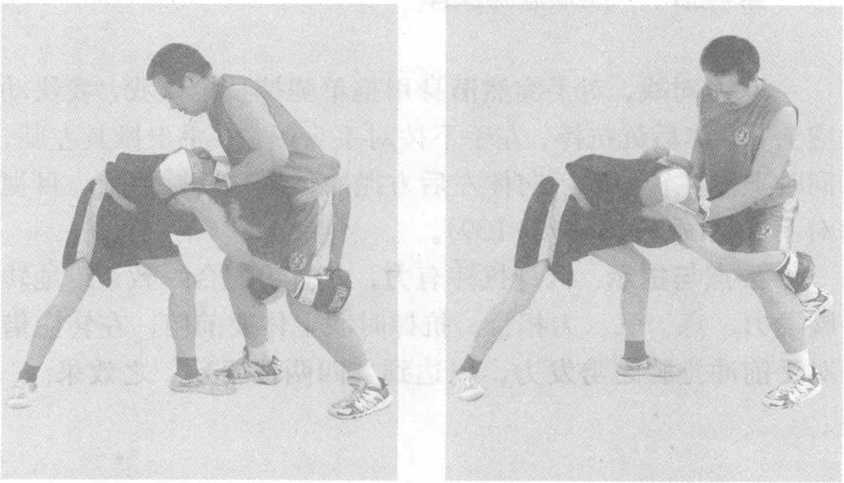 双方对战,对手突然潜身用抱双腿摔技进攻我,我快动 应变,左右手下按对手肩背处,同时右腿后撤,双脚蹬地抗