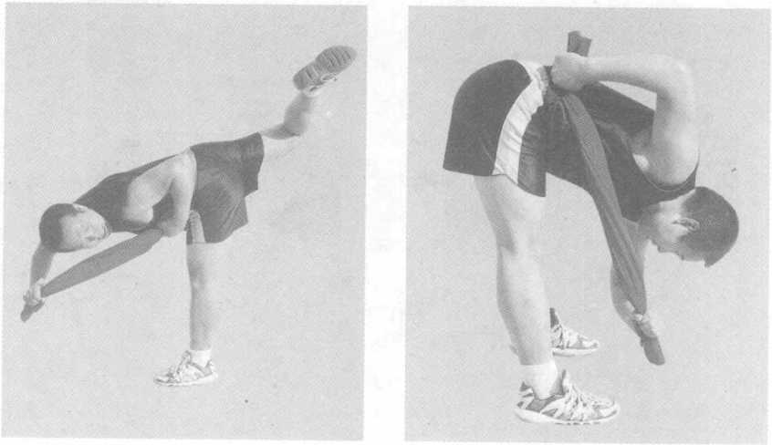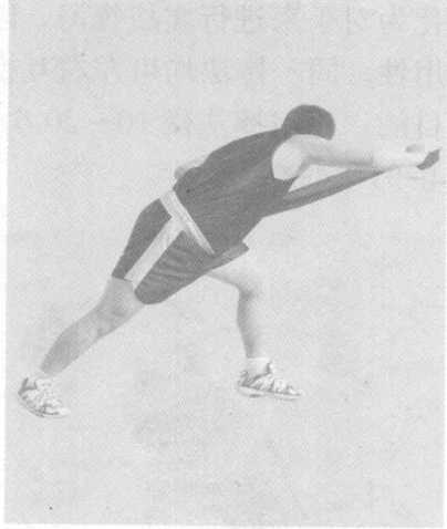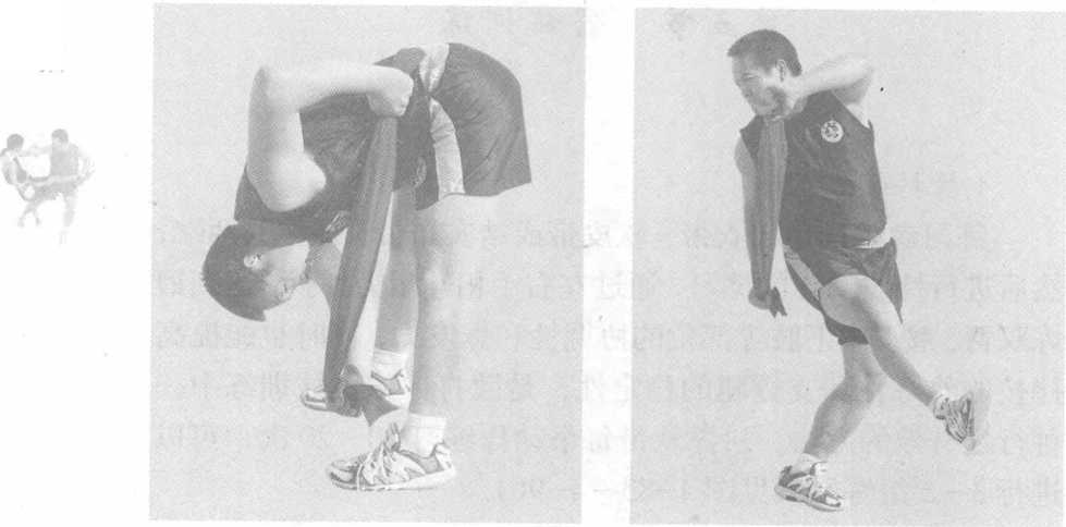 练习者可选用跤衣带、软皮带或结实布带,抓握其两端, 然后进行摔技动作的练习,通过左右手相互用力撑抖,达到锻 炼双臂、腰腹、下肢等部位的协调性和爆发力,同时也能提高 摔技的熟练性和支撑腿的稳定性,是散打摔技器械训练中一 种行之有效的方法。抖撑软带每个动作练习10?20次,可以 进行3?5组练习(见图4一83?4一90)。