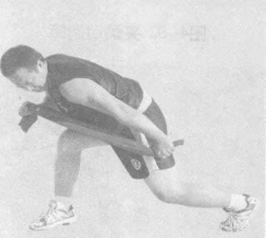 乙方双腿蹲变成弓步,双手卡腰,竖颈立腰,甲方双手 各抓握短棍一端,身体后坐,同时用棍中段挂拉乙方头颈处, 进行抗力练习,目视前方(见图4一79?4一80)。