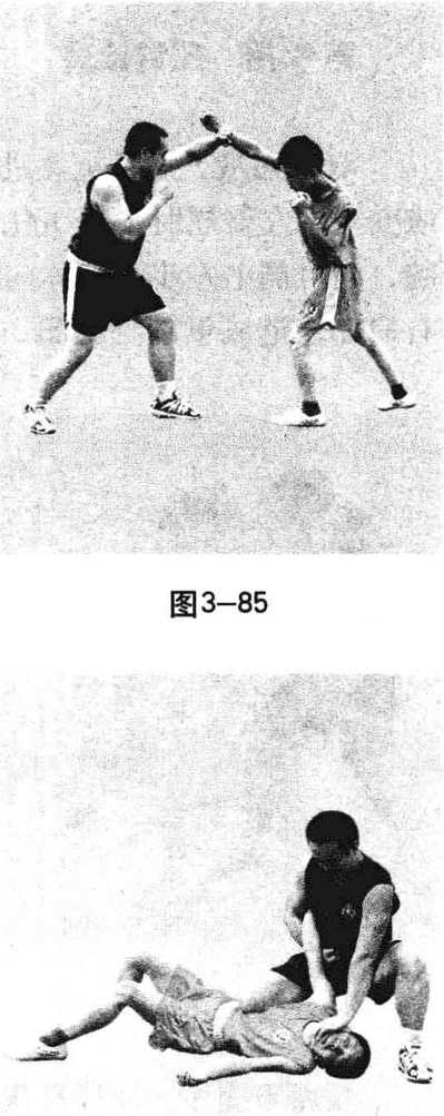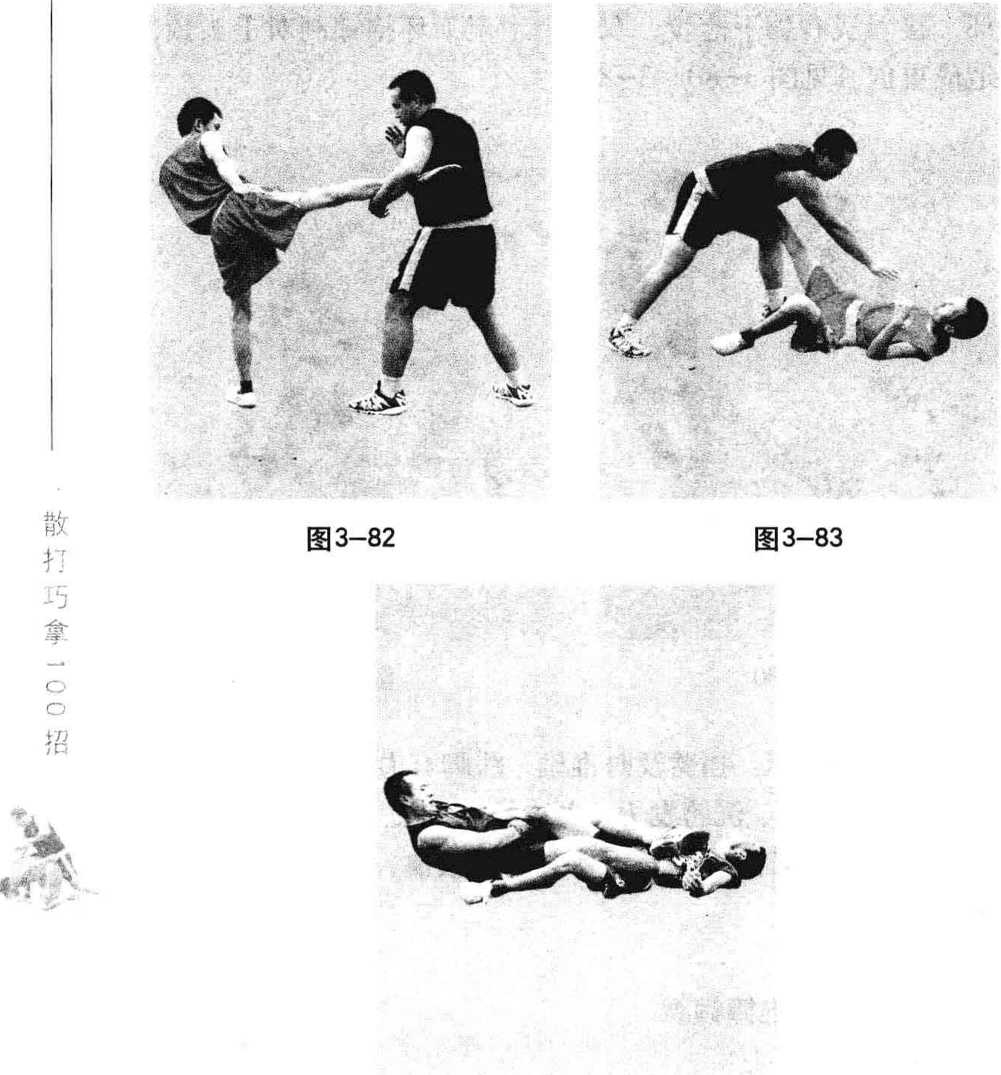 图 3-84要点与提示:接腿准确,推摔快猛,锁踝时双手与双脚 上下形成争力,同动一致,快速有力,仰身展腹发力,力达 触点,意、气、力相合。运用此招时,我右腿要暗藏下压对 手左腿之力,以防其反攻。