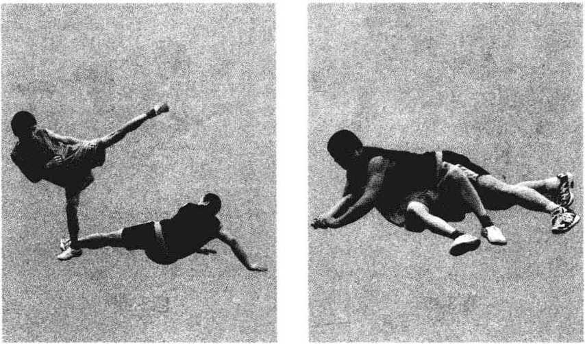 腿向下劈砸其左膝窝。同时 我顺势倒地,用右手推折对 手左脚面,用右腿直膝垫插 其左膝窝内,左手下按对手 后背,进行折踝,造成重创 (见图 3-99 ?3-101)。
