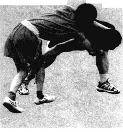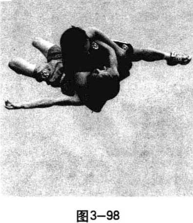 双方对战相互缠抱,我突然用左手抓拉对手右手,右手 下别其右膝处,同时身体左转,使用手别摔将对手摔倒在地, 接着我顺势侧倒身,用右臂猛力夹锁对手的头颈,左臂抱控 其右臂,造成重创(见图3-97?3-98)。