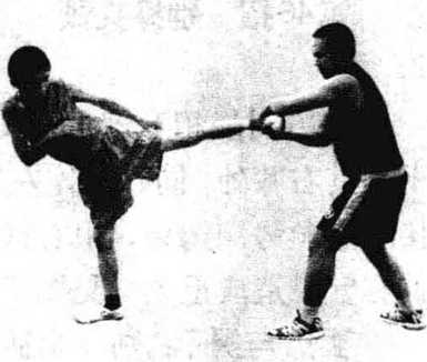 双方对战,对手突然发左侧踹腿攻踢我胸部,我快动应 变,用双手合抱破化来腿,接 、