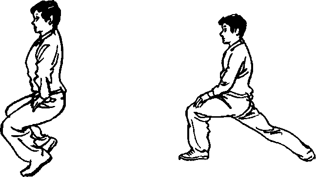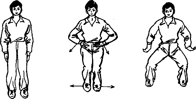 由站立姿势开始,两手叉腰,轻松起跳,两腿向两侧分 开,下蹲成马步,继而双腿收回。反复练习。(图^?1?14~图^?L16)