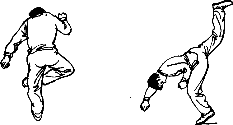 7 .扔空腿 由盘腿开始,上体猛然前探,一腿向后上方扔空踢出, 脚板朝上,同侧手臂向身体前方下压,以保持平衡。左右腿互换练习。 (图 ^?l?19~图^?l-2o)