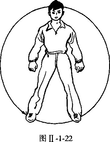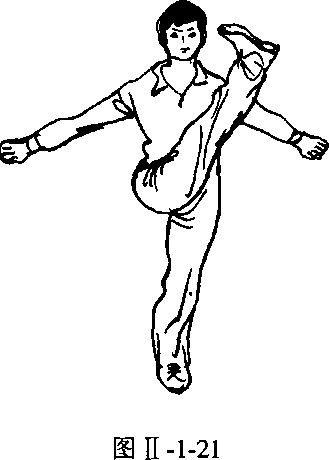 8 .过腿 也叫“摆莲腿;身体直立,左脚向前上步,右腿向左上 方踢起,以自己头上方为最高点,画一个圆圈,落到原地。左右交换练 习。(图^”-21~图^,22)