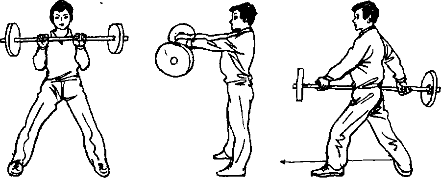 两手抓握石担,放置在体前,左弓步,侧身开立。(图n-L88)